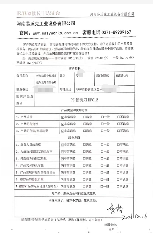 當(dāng)月呼和浩特中燃公司收到易沃克PE管鍘刀后立即開(kāi)始現(xiàn)場(chǎng)燃?xì)釶E管切割搶修現(xiàn)場(chǎng),現(xiàn)場(chǎng)工人師傅反饋使用后贊不絕口,這個(gè)易沃克廠家的PE管鍘刀質(zhì)量和效率真不錯(cuò),十多分鐘就可以帶氣切割大大提供現(xiàn)場(chǎng)搶修PE管切割時(shí)間,而且燃?xì)夤艿缼釶E管切割操作,現(xiàn)場(chǎng)師傅說(shuō)前幾年一直用的美國(guó)進(jìn)口PE管鍘刀,想不到我們國(guó)產(chǎn)易沃克PE管鍘刀效果這樣好我們易沃克廠家的售后服務(wù)團(tuán)隊(duì)跟蹤一直在跟進(jìn)使用效果以及現(xiàn)場(chǎng)視頻免費(fèi)技術(shù)指導(dǎo),下面是燃?xì)夤艿垃F(xiàn)場(chǎng)PE管鍘刀使用效果反饋圖 和售后的服務(wù)評(píng)價(jià)表