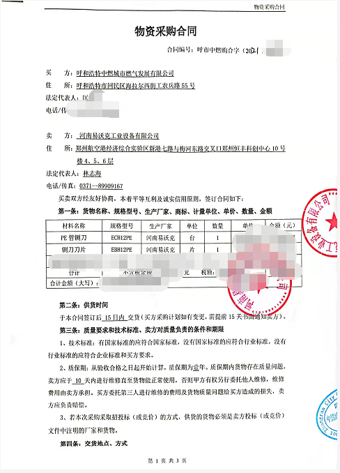 2021年10月份呼和浩特中燃燃?xì)饧瘓F(tuán)有限公司采購(gòu)?fù)踅?jīng)理與我們河南易沃克工業(yè)設(shè)備有限公司業(yè)務(wù)員進(jìn)行電話溝通洽談了解易沃克產(chǎn)品主要服務(wù)于燃?xì)?、石油石化現(xiàn)場(chǎng)管道搶修、手動(dòng)防爆冷切割刀、PE管止氣封堵、PE管鍘刀和PE管刮皮刀等搶修設(shè)備比較感興趣,經(jīng)過(guò)多次電話溝通確認(rèn)易沃克廠家產(chǎn)品比較符合中燃燃?xì)猬F(xiàn)場(chǎng)PE管切割搶修,在10月8號(hào)兩家公司簽訂PE管鍘刀采購(gòu)合同。